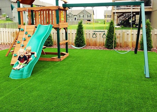 Искусственное покрытие для игровой площадки хоть и дороже, но имеет больше плюсов. Такое покрытие безопасно, оно не горит и не плавится,